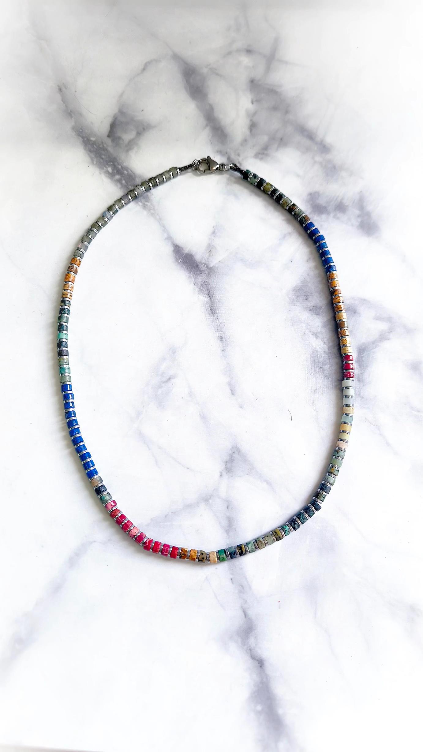 שרשרת אבני חן בסגנון חיתוך 'סלייסים' – שפע חרוזים בגוונים טבעיים של תכלת, חום, טורקיז, אדום.