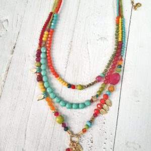 שרשרת עם המון נוכחות בסגנון אקלקטי, חברותית במיוחד: מעורבת חומרים וסגנונות, עץ, מקלות בראס, אבני קוורץ, ג'ייד, רובי וחרוזי עץ.