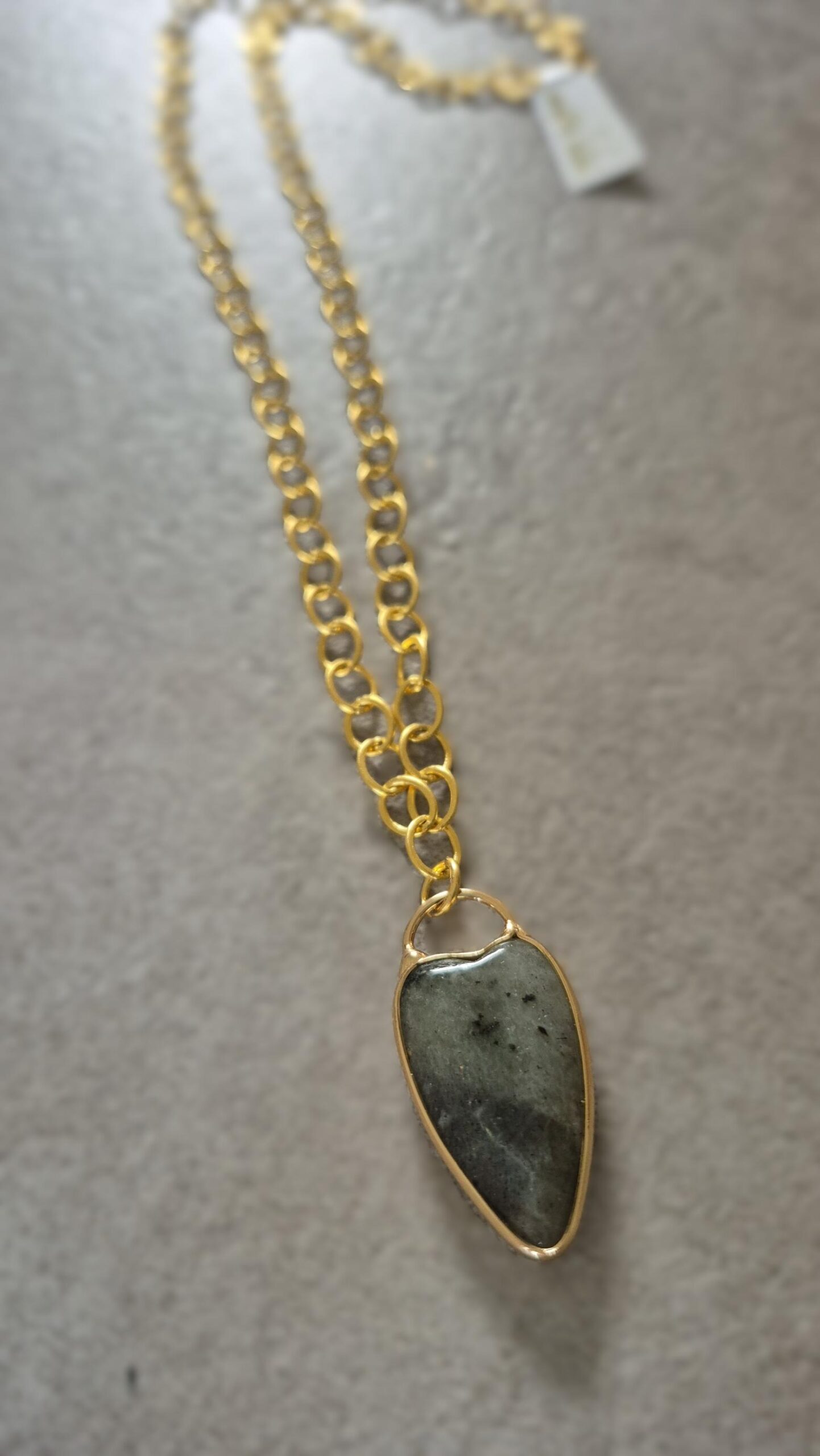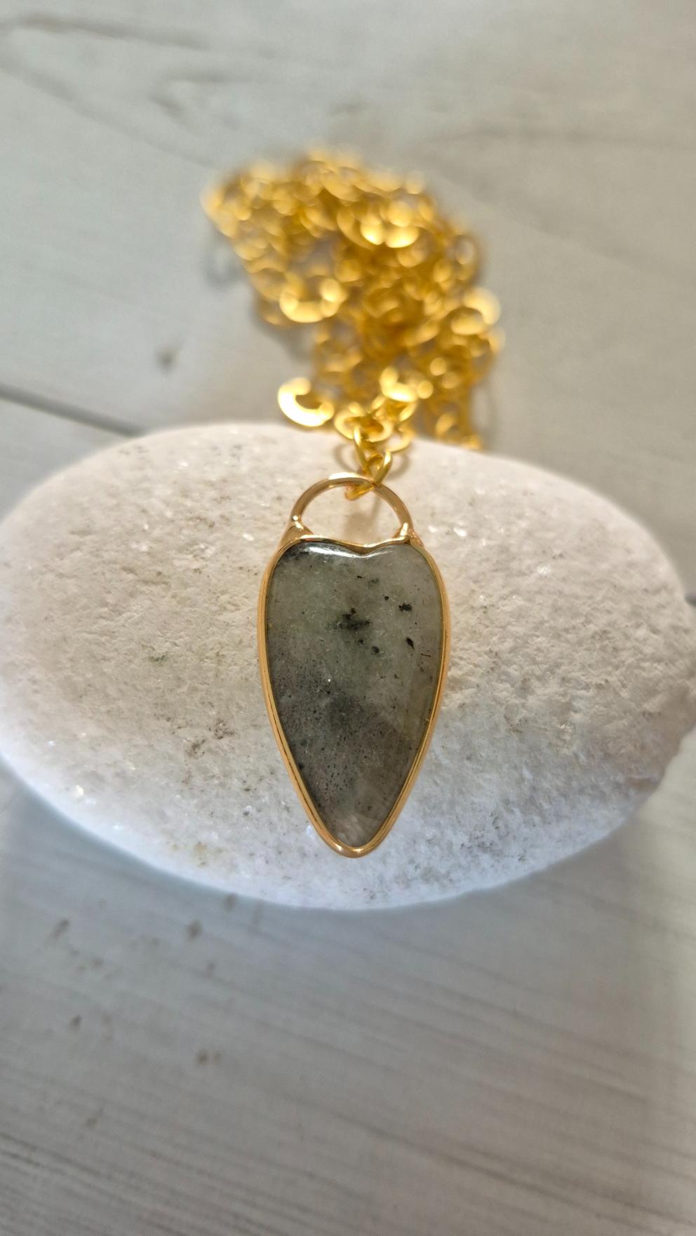 שרשרת לולאות גדולות בציפוי זהב מט, עם תליון אבן לברדורייט בגוון אפור עמוק, בתורת לב וממוסגרת בזהב.