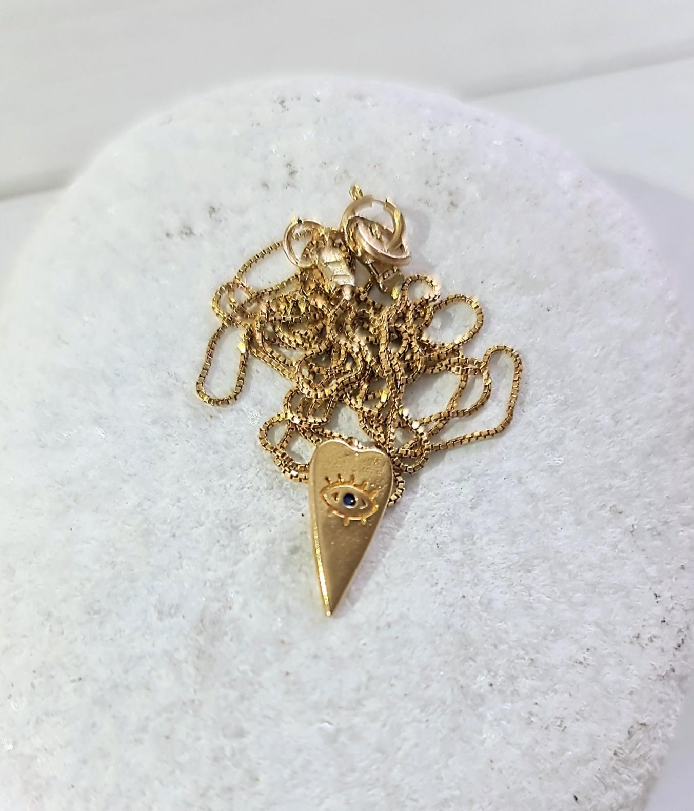 שרשרת מיוחדת עם תליון תליון לב מאורך ועליו 'ציור' עין משובצת זרקון כחול.