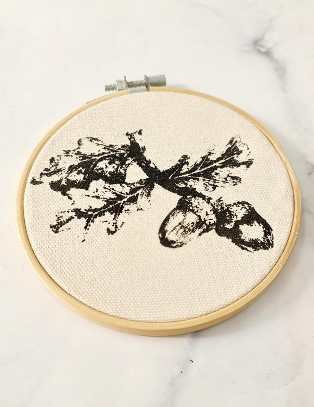 הדפס ענף עם בלוטים בשחור על בד בצבע אוף וויט.